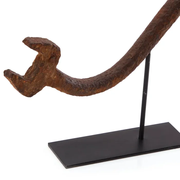 Details: Sculpture of an iron wrench warped into a s-curve suspended by a metal rod on a black stand