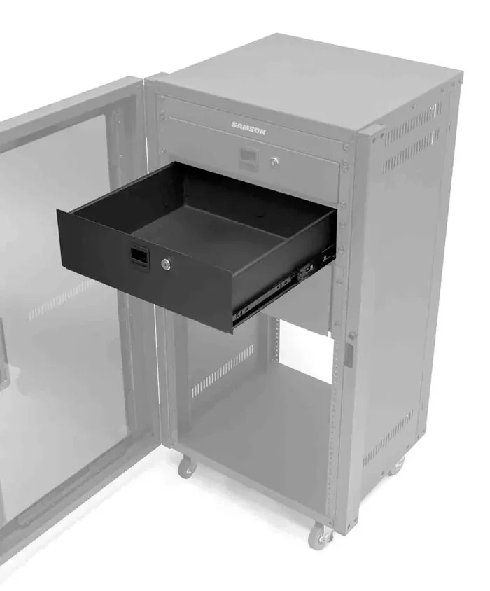 The Samson SRKDR2U Universal Rack Drawer – 2 RU provide secure, yet easily accessible storage options for your non-rackmount able gear. Available in four sizes (1-space [DR1U], 2-space [DR2U], 3-space [DR3U], 4-space [DR4U]), these fully enclosed drawers are ruggedly constructed of cold rolled steel plates capable of holding up to 50 pounds (33lb for DR1U) of equipment. They each feature a spring-loaded latch and heavy-duty, smooth glide drawer slides for quiet, effortless opening and closing (no latch, standard drawer slides on DR1U), as well as a rear grommet for cable access. A lock knockout, lock and key are also included with each rack drawer. While perfectly compatible with any standard equipment rack, the SRK Rack Drawers are ideal for use with the Samson SRK and SRK Pro Racks.