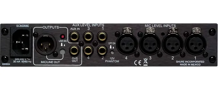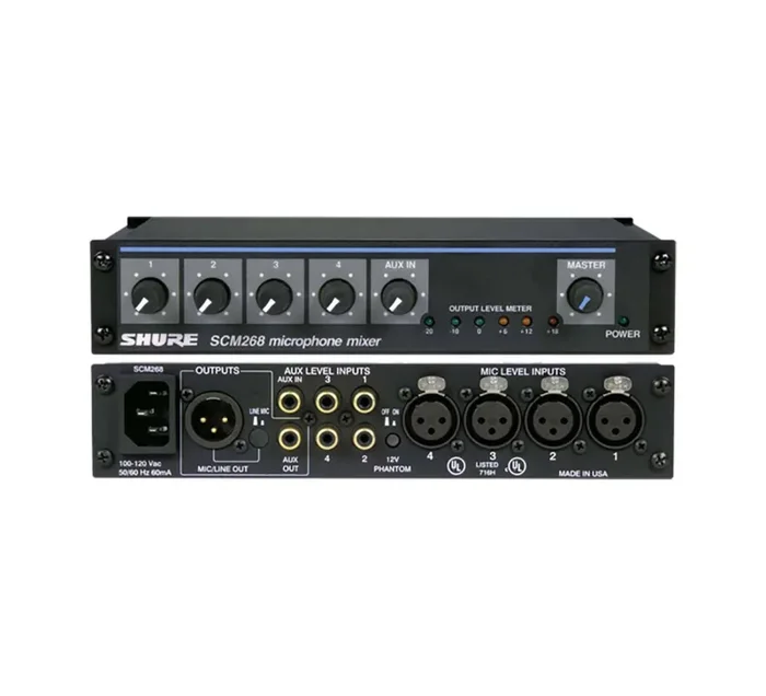 The Shure SCM268 is a 4-channel microphone mixer delivers superior performance and excellent sound quality with low noise and a flat frequency response. Includes 4 transformer-balanced inputs, 5 -10 dB line-level inputs, 12 volt phantom power, and built-in low-cut filter.