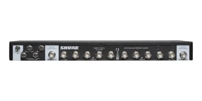 Shure UA844+SWB: Five-way active antenna splitter and power distribution system for QLX-D, ULX, ULX-D, SLX, and BLX (BLX4R only) receivers. (470-952 MHz)