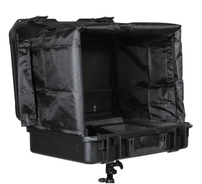 The sunscreen includes a collapsible frame for secure storage. The bottom of the case features a built in 3/8″ female thread which is reinforced by a heavy-duty metal plate. Any light stand, tripod, or mic stand will work to support the case as long as it has or is adapted to a 3/8″ male mount and can handle the weight of the laptop, case, and other accessories.