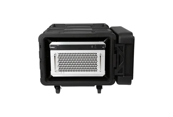 Both front and rear lids are designed to protrude into the base of the case approximately 1″ with a unique double wall structure that makes them incredibly rigid where this intersection occurs, providing MIL-SPEC sealing characteristics with significantly fewer latches than most competitive cases. This revolutionary design allows for rapid deployment in an up-right configuration, even when stacked — 3SKB Roto Shock Racks are the only shock racks in the marketplace today that will open front and back while stacked.