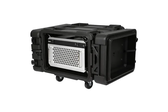 The SKB Cases 3SKB-R906U24, rSeries Shock Rack – 6U features a standard depth of 24″ from front to rear rail, with lid depths of 4.5″ per lid. All 3SKB Series Roto Shock Racks feature a compound hinge system that allows the lid to swing out and completely around to lie flat against the main body of the case. This also enables effortless removal/reinstallation of the lid with a simple lift motion.