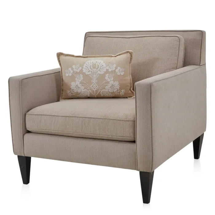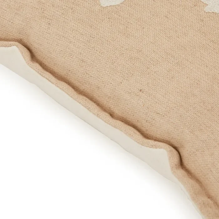 Details: Tan lumbar pillow with embroidered white flowers