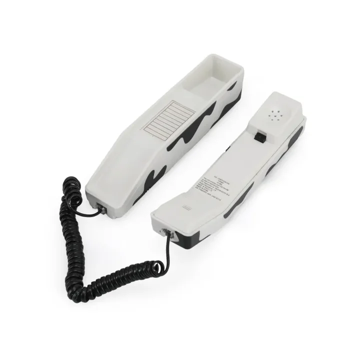 Details: Vintage cow print phone with pink buttons.