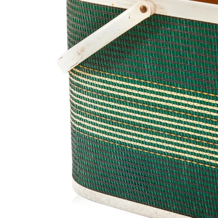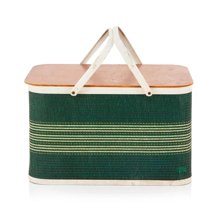 Details: Vintage green and orange striped wicker basket with white frame and handles