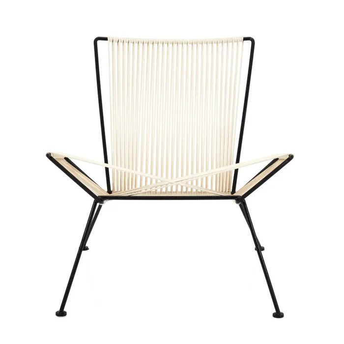 Details: Hans J. Wegner Style Lounge Chair, Black Metal Frame, White Elastic Cord, Outdoor, Rope
