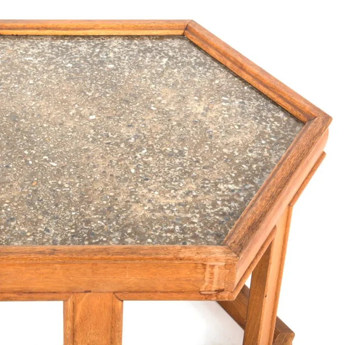 Details: Hexagon walnut side table with gold and pebble reflective top